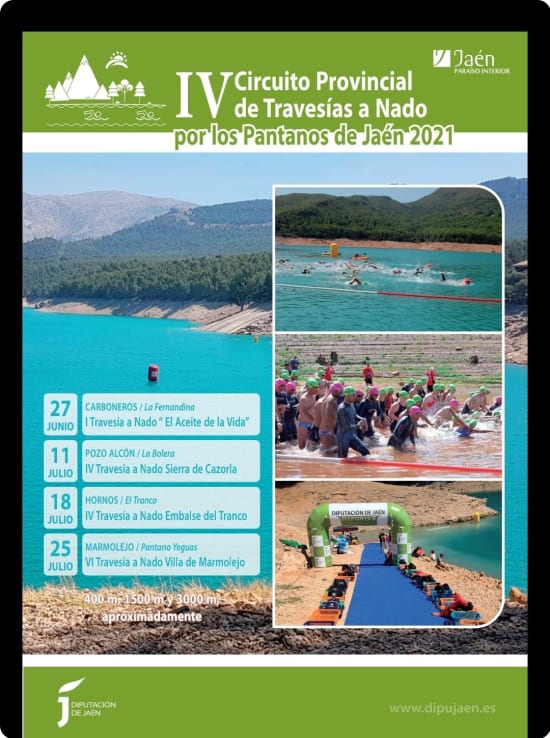 La Diputación Provincial de Jaén, teniendo como objetivos la promoción y el fomento de la práctica del deporte en el medio natural, convoca el “IV Circuito Provincial de Travesías a Nado por los Pantanos de Jaén 2021”
