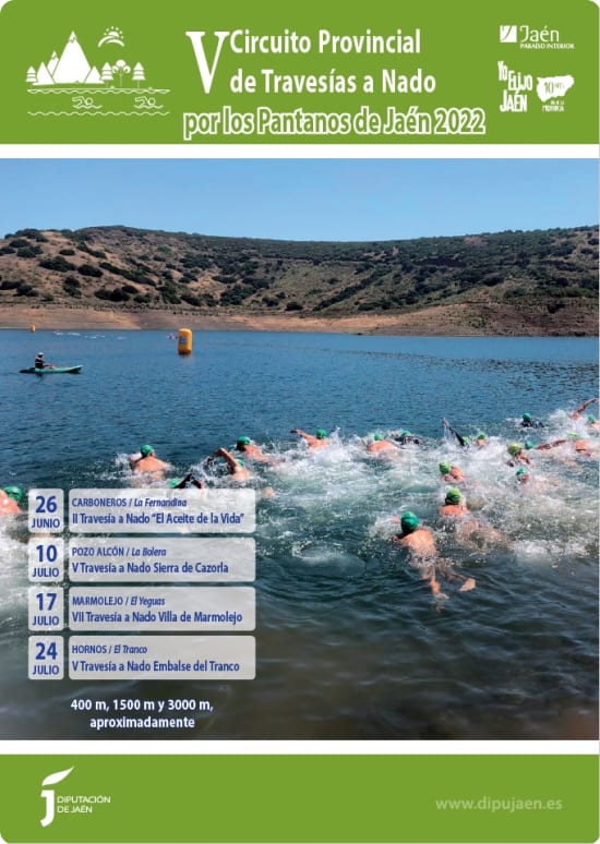 La Diputación Provincial de Jaén, teniendo como objetivos la promoción y el fomento de la práctica del deporte en el medio natural, convoca el “V Circuito Provincial de Travesías a Nado por los Pantanos de Jaén 2022”