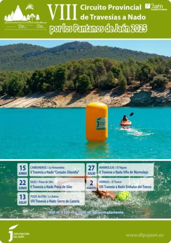 La Diputación Provincial de Jaén, teniendo como objetivos la promoción y el fomento de la práctica del deporte en el medio natural, convoca el “VIII Circuito Provincial de Travesías a Nado por los Pantanos de Jaén 2025"