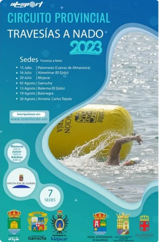 El Circuito Provincial de Travesías a Nado de Almería contará con 7 pruebas y sedes diferentes y se desarrollará durante los meses de julio y agosto. Se trata de un circuito de competiciones deportivas populares: permite su práctica tanto para nadadores con licencia federativa en vigor, como deportistas no federados “aficionados”