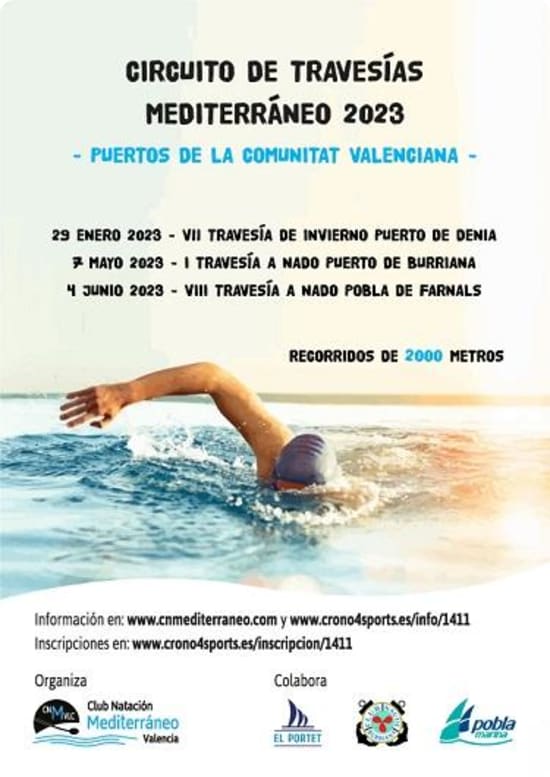 El Club Natación Mediterráneo Valencia, con la colaboración de la Marina El Portet de Dénia, del Club Naútico Burriana y del puerto deportivo Pobla Marina, organiza la primera edición del Circuito de travesías Mediterráneo 2023 – Puertos de la Comunitat Valenciana