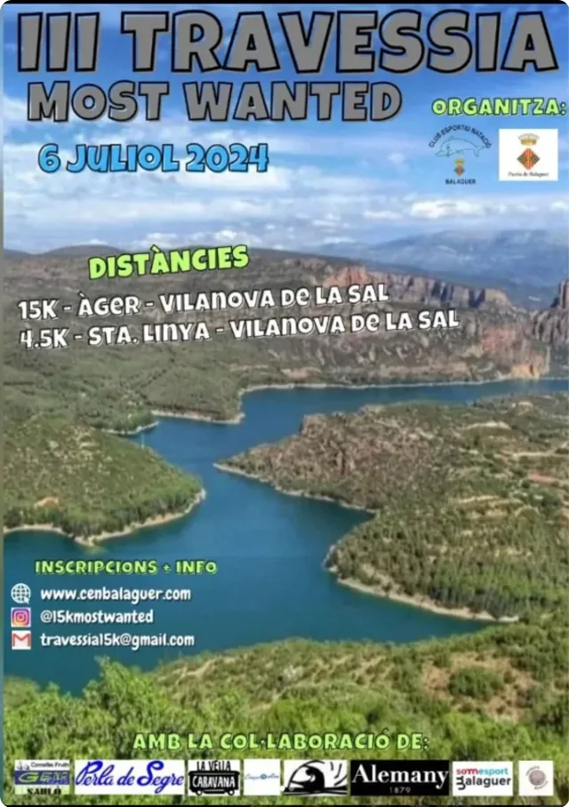 La inscripción da derecho a avituallamientos, desplazamiento Vilanova de la Sal – Àger (15k) o Vilanova de la Sal – Santa Linya (4.5k), camiseta conmemorativa, etc. Si algún participante desea realizar las pruebas con neopreno, deberá contactar con la organización con suficiente tiempo para solicitar la aprobación. La travesía se realizará siempre y cuando la temperatura del agua no esté por debajo de 16 grados, con gafas de natación, bañador y boya de seguridad con un compartimento estanco y gorro de baño que será facilitado por la organización. Mas información, imágenes y recorrido en el reglamento, a continuación: