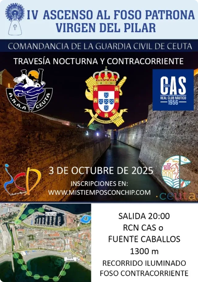 De Puerto Deportivo a Fuente Caballos. Recorrido iluminado. Al finalizar, bebidas y pinchitos para los participantes. El IV Ascenso al Foso Patrona Virgen del pilar es una prueba de natación de aguas abiertas nocturna y contracorriente que organiza la Asociación de Aguas Abiertas de Ceuta junto con la Comandancia de la Guardia Civil de nuestra ciudad.