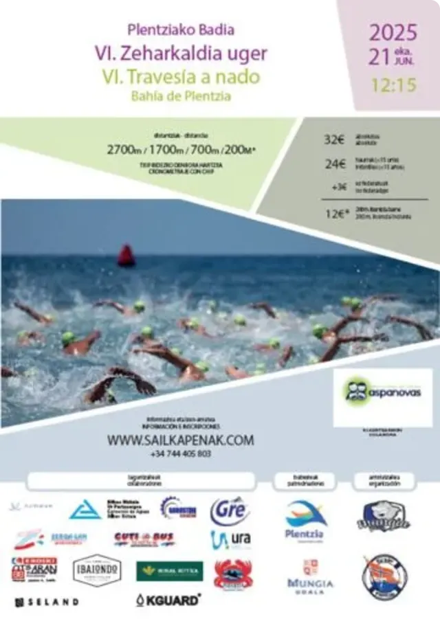 Travesía a nado con salida desde la playa de Plentzia. Recorridos delimitados por boyas. Tiempo límite de 1h15min para pruebas de 2700m y 1700m, y 30min para 700m. Entrega de gorros y marcaje a las 10:30h. Salidas escalonadas según distancia.