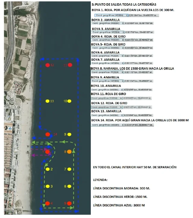 El tiempo límite para cubrir el trayecto de 1500 metros será de 1:00 horas y para la travesía de 3000 metros será de 2 horas y 10 minutos. Es admitida la boya de seguridad pero no es obligatoria. El punto de encuentro y la salida serán en la playa de la Patacona (Alboraya), en frente de la plaza Juan Baptista Basset, situada a la altura de nº 23 de la Avenida mare Nostrum, 46120 Alboraya.