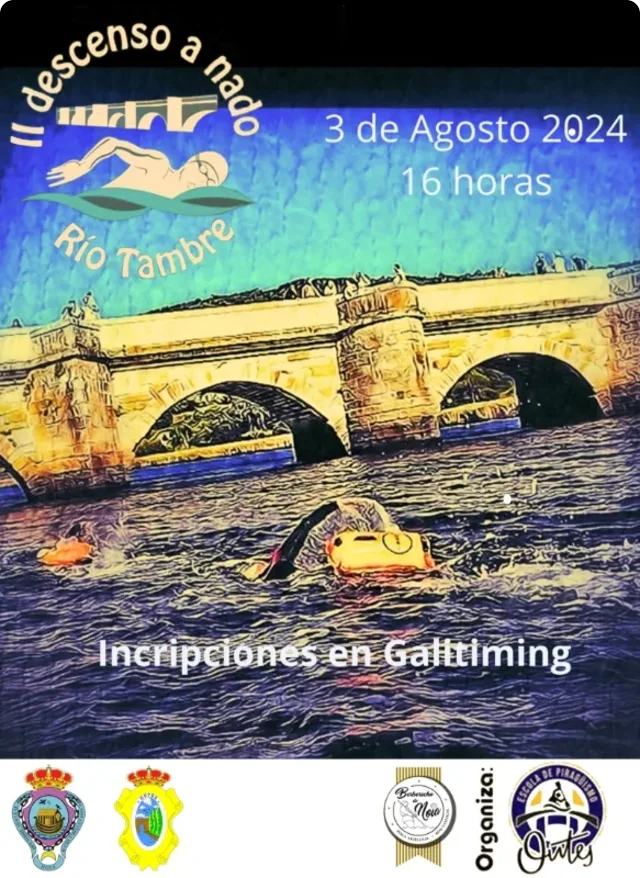 Descenso a nado de 4.800 metros en el río Tambre. Participantes mayores de 14 años. Incluye seguro, traslado, gorro, chip y avituallamiento. Salida desde la Central Eléctrica del Tambre.