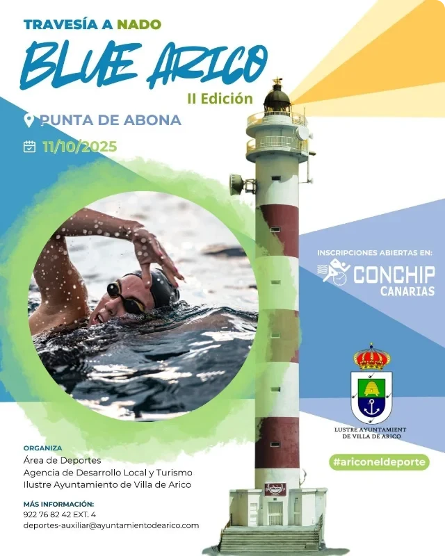 Travesía a nado de 1.350 metros con salida desde el muelle del Porís de Abona y llegada en la Playa de La Punta. Participación abierta a nadadores de 16 a 75 años. Menores tendrán distancias adaptadas. Límite de 350 participantes (70 menores y 280 adultos).
