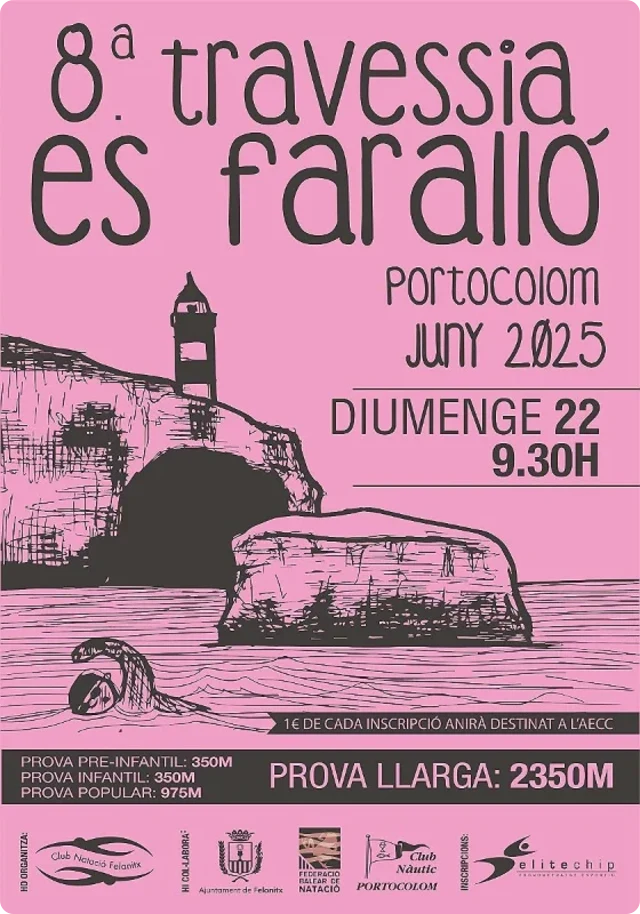 Travesía a nado con diferentes pruebas para pre-infantiles, infantiles, prueba popular y prueba larga. Incluye gorro, seguro y avituallamiento. El Club Natació Felanitx destina 1 euro por participante a la Asociación Española Contra el Cáncer.