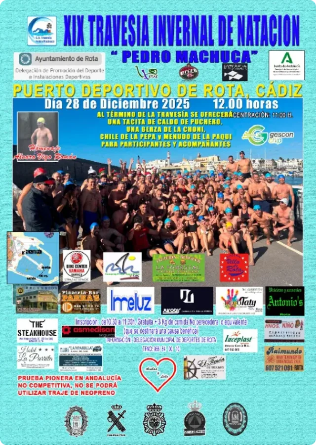Travesía a nado de 100 metros en el Puerto Deportivo de Rota. Inscripción gratuita a cambio de 3kg de alimentos no perecederos. Menores deben ir acompañados de un adulto. Concentración e inscripciones de 10:00 a 11:30h. Salida a las 12:00h. Esta prueba no es competitiva.