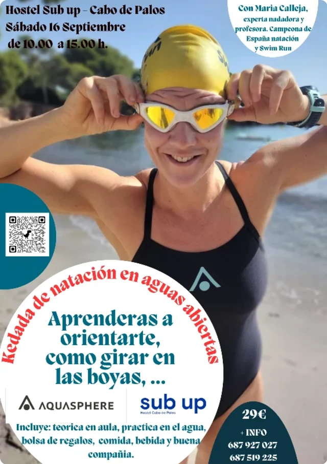 Con María Calleja, experta nadadora y profesora. Campeona de España natación y SwimRun. Aprende a orientarte, cómo girar en las boyas, etc. Incluye teoría en aula, práctica en el agua, bolsa de regalo, comida, bebida y buena compañia