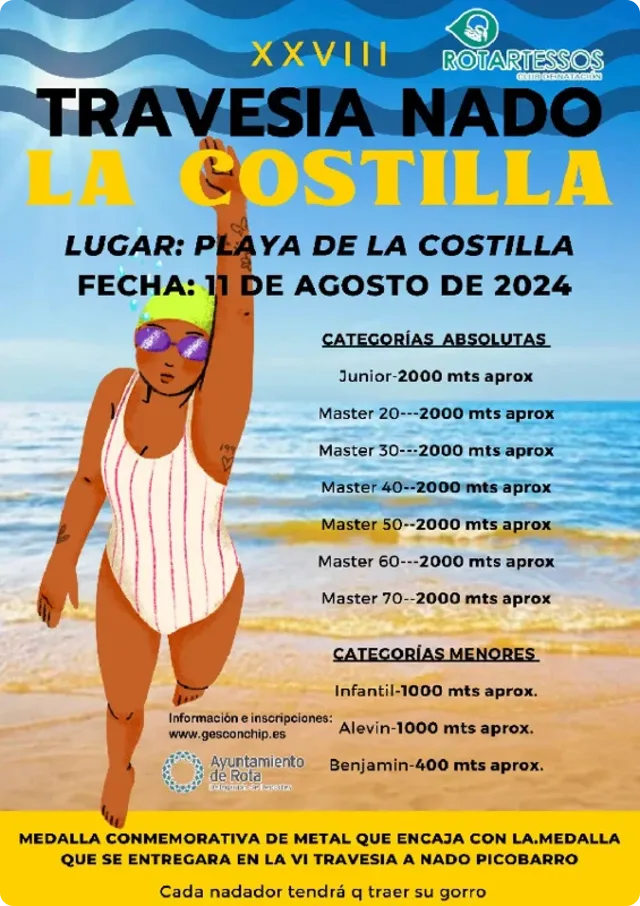 El Club Natación Rotartessos organiza, en colaboración con la Delegación de Deportes de Rota, la XXVIII Travesía a Nado La Costilla, que se celebrará el domingo 11 de agosto de 2024 en la playa de la Costilla en Rota, Cádiz.