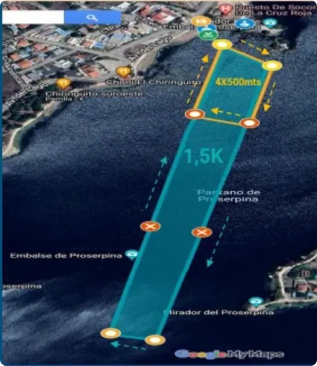 Area de calentamiento: Ubicada a la derecha de la salida. Estará balizada con una boya a 50 mts de la orilla. El tiempo de marcaje se efectuará desde 1 hora 30 min antes del inicio de cada prueba, hasta 30 min antes de la salida correspondiente.