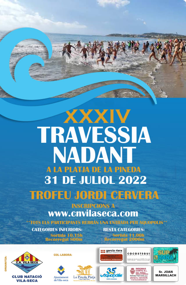 Es tradición para nuestro club la anual Travesía de la Pineda, donde ya están las inscripciones abiertas, ¿no te has inscrito todavía? Domingo 31 de julio 2022, los tres primeros clasificados tendrán premio en metálico, y TODOS los participantes tendrán una entrada gratuita en Aquópolis Costa Daurada