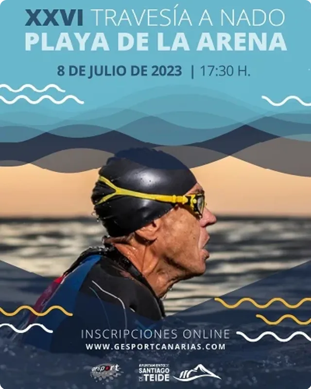 La XXVI Travesía a Nado Playa de La Arena se celebrará el 8 de julio de 2023, nadando una distancia de 950 metros desde la Playa La Arena hasta la Playa de Puerto de Santiago