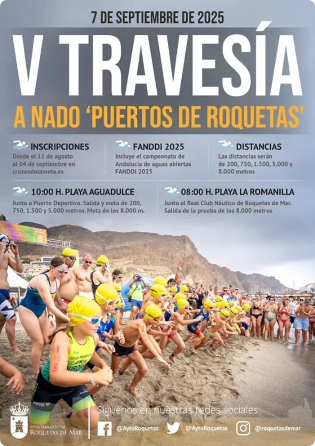 Travesía a nado en Roquetas de Mar con múltiples distancias. Evento organizado por el Área de Deportes, Cultura y Tiempo Libre del Ayuntamiento de Roquetas de Mar.