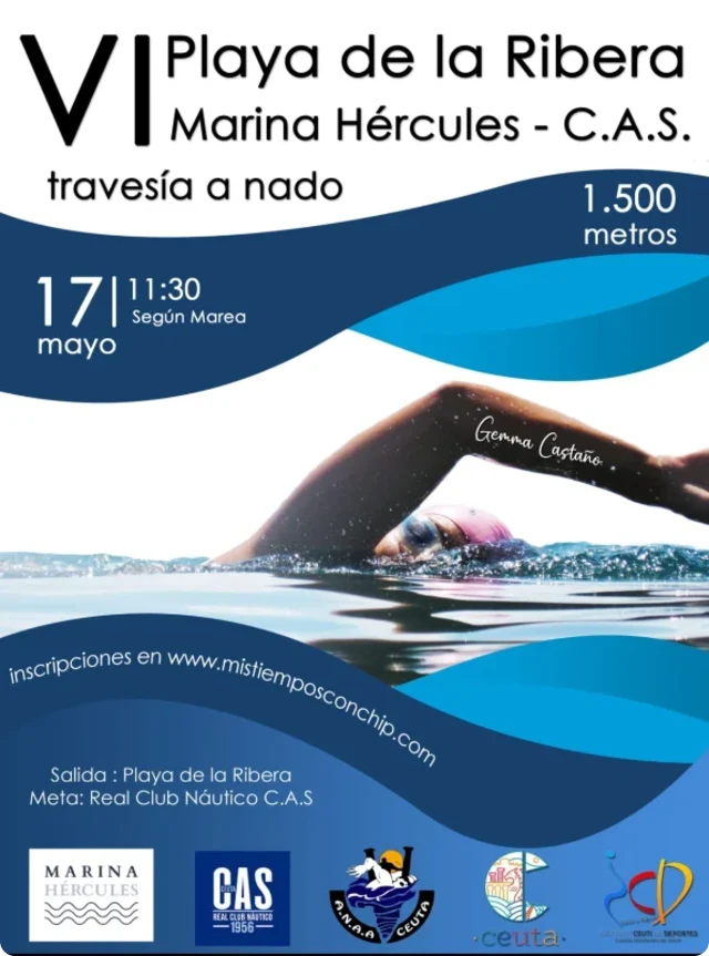 Evento de natación en la Playa Ribera - Fuentecaballos en Ceuta. Salida y llegada en el mismo lugar. Recomendable llevar equipamiento adecuado para natación en mar.