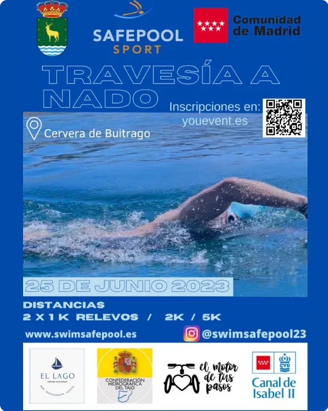 La I Travesía a nado Cervera de Buitrago organizada por «Safepool Sport» tendrá lugar el domingo día 25 de junio de 2023. Todos los permisos solicitados en tiempo y forma a la Confederación Hidrográfica del Tajo, Canal de Isabel II, Comunidad de Madrid y Ayuntamiento de Cervera de Buitrago