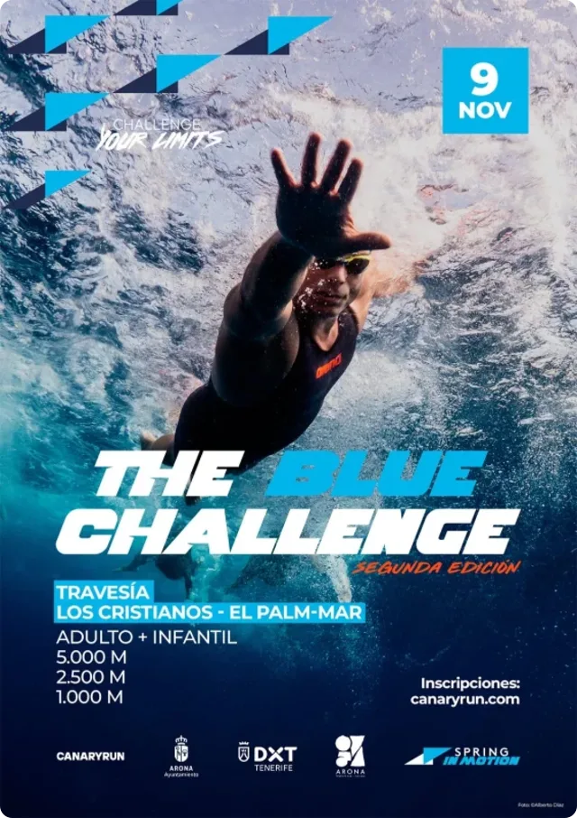 Travesía a nado en la costa de Tenerife con múltiples distancias para nadadores de diferentes niveles. Evento que recorre las playas de Los Cristianos y Palm-Mar con opciones de 1, 2.5 y 5 kilómetros.