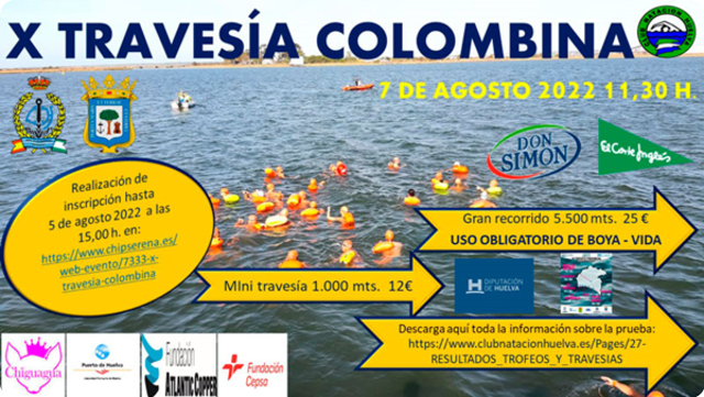 La X Travesía Colombina se celebrará con dos modalidades: Gran Recorrido (5.500 m) y Mini Travesía (1.000 m). La distancia de 5000m es puntuable para el circuito de aguas abiertas de Huelva