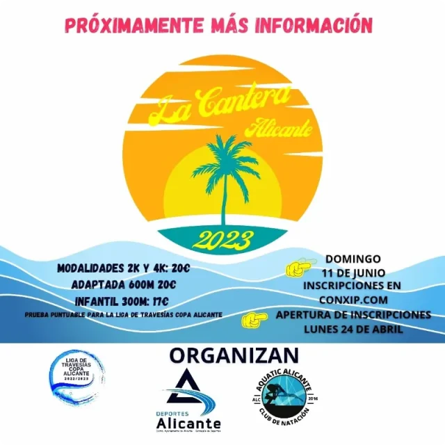 Volvemos con la VI travesía de La Cantera en la playa de la Albufereta: además de las 2 distancias (2k y 4k) tendremos como novedad una para los peques (8 a 13) de 300 metros, y otra de natación adaptada para que todas las personas puedan participar en nuestro evento: 600 metros, organizada junto con @aquarium_ce