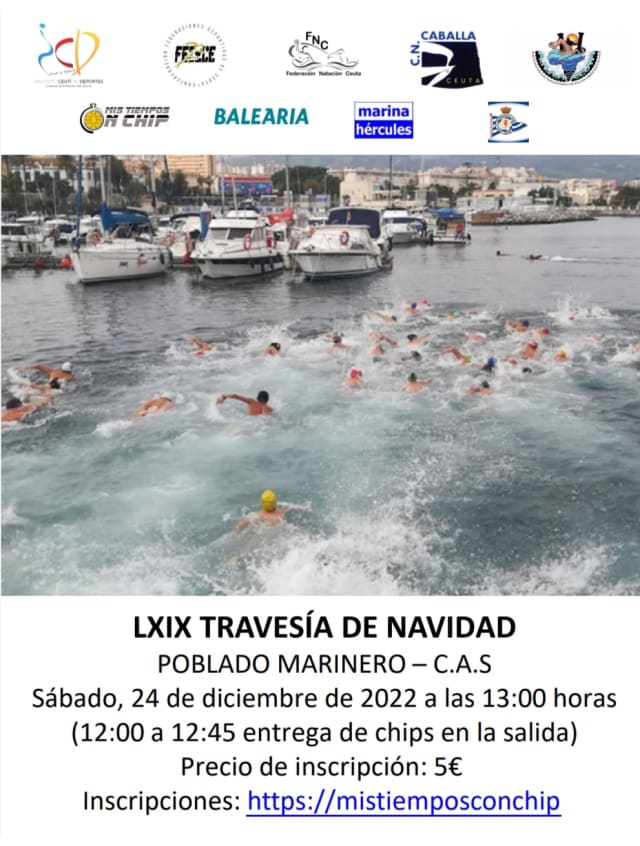 Edición 69 de la Travesía de Navidad organizada por el Club Natación Caballa, con la colaboración del Instituto Ceutí de Deportes, la Federación de Natación de Ceuta y la Asociación de Natación en Aguas Abiertas, que se celebrará el próximo 24 de diciembre