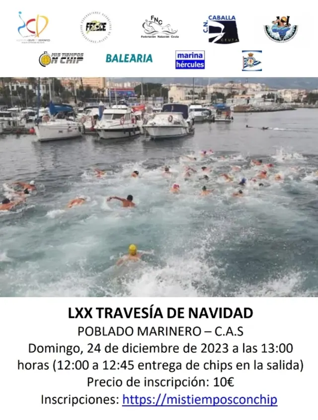 Edición 70 de la Travesía de Navidad organizada por el Club Natación Caballa, con la colaboración del Instituto Ceutí de Deportes, la Federación de Natación de Ceuta y la Asociación de Natación en Aguas Abiertas, que se celebrará el próximo 24 de diciembre