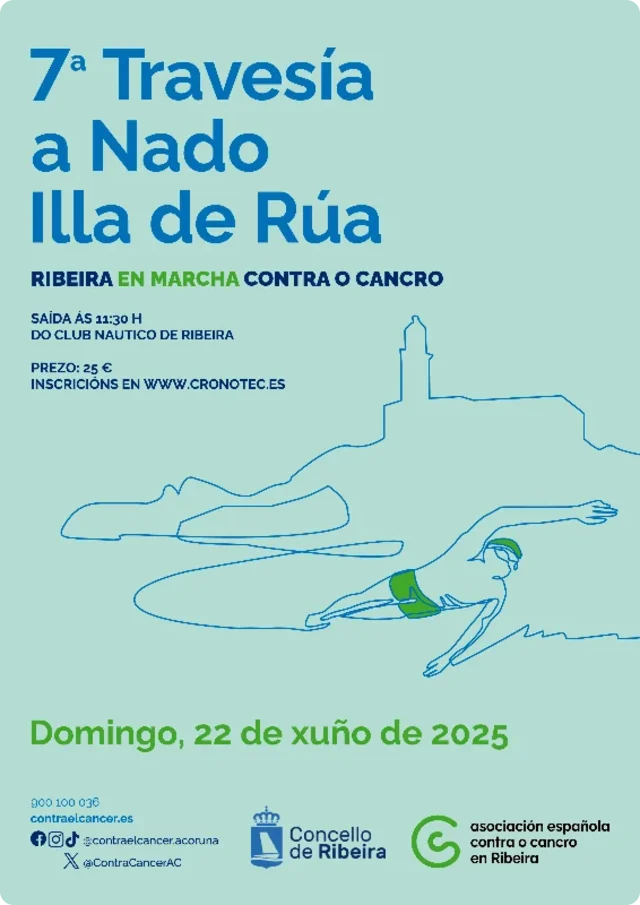El tiempo límite para cubrir la distancia de 4.400 metros será de 2h 30'. La VII Travesía a nado Illa de Rúa – Ribeira se celebrará el Domingo día 22 de Junio de 2025. La salida se dará a las 11.30 desde la Illa de Rúa siendo la llegada en el Club Náutico de Ribeira cubriendo una distancia de 4.500 metros. Los participantes deberán presentarse en el control, situado en el Club Náutico para el transporte a la Illa de Rúa, a las 10.45 para identificación y embarque. Al finalizar la Travesía habrá servicio de duchas en Club Náutico. Dispondremos de una carpa para servicio de guardarropa. Es aconsejable el uso del neopreno durante la prueba.