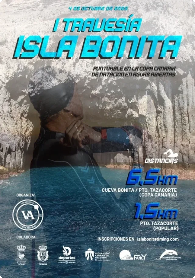 Travesía de natación en aguas abiertas en La Palma con dos distancias: 6.5 km y 1.5 km. Recorrido espectacular por el noroeste de la isla, incluyendo el paso por la Cueva Bonita.