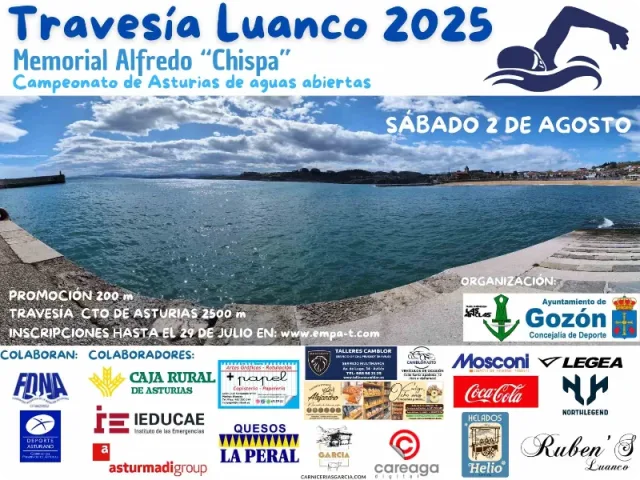Travesía de natación en aguas abiertas en Luanco, Asturias. Evento memorial que incluye diferentes categorías y distancias para nadadores federados y no federados. Campeonato de Asturias de Aguas Abiertas.