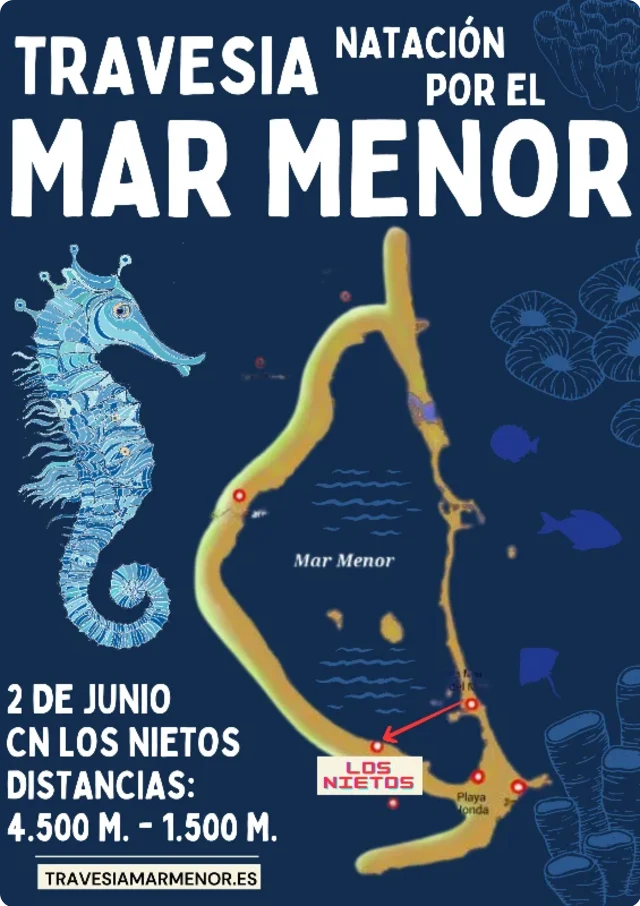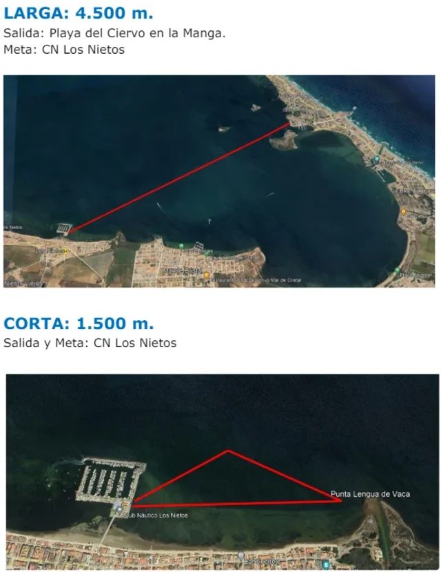 Larga (4.500m): Salida desde la Cala del Turco en la Manga y Meta en el CN Los Nietos. Corta (1.500m): Salida y meta en el CN Los Nietos.