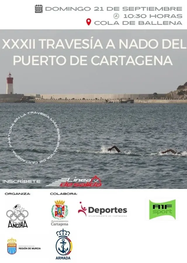 Organiza: Federación de Natación de la Región de Murcia, Club Natación Marina Cartagena Ancora, Concejalía de Deportes Ayuntamiento de Cartagena. La jornada comenzará a las 9:00 h con el marcaje, dando paso a la prueba benjamín-alevín (800 m) a las 10:30 h, y a las categorías infantil, junior, absoluta y máster (3.000 m) a las 11:00 h.