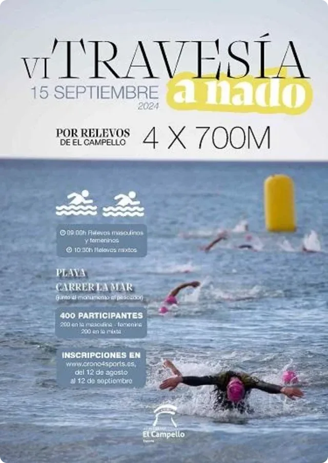 Travesía de carácter popular por relevos en equipos de 4 personas: Cada uno de los miembros del equipo tiene que realizar el circuito a nado, de forma individual y en el orden que acuerden previamente en la inscripción. No hay descanso y no se para el tiempo de carrera entre relevista y relevista.