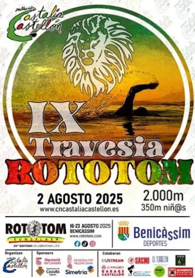 Travesía con dos recorridos: Open de 2000m y Rototom Kids de 350m. Incluye traslado en autobús, guardarropa y avituallamiento. Premios para los tres primeros de cada categoría.