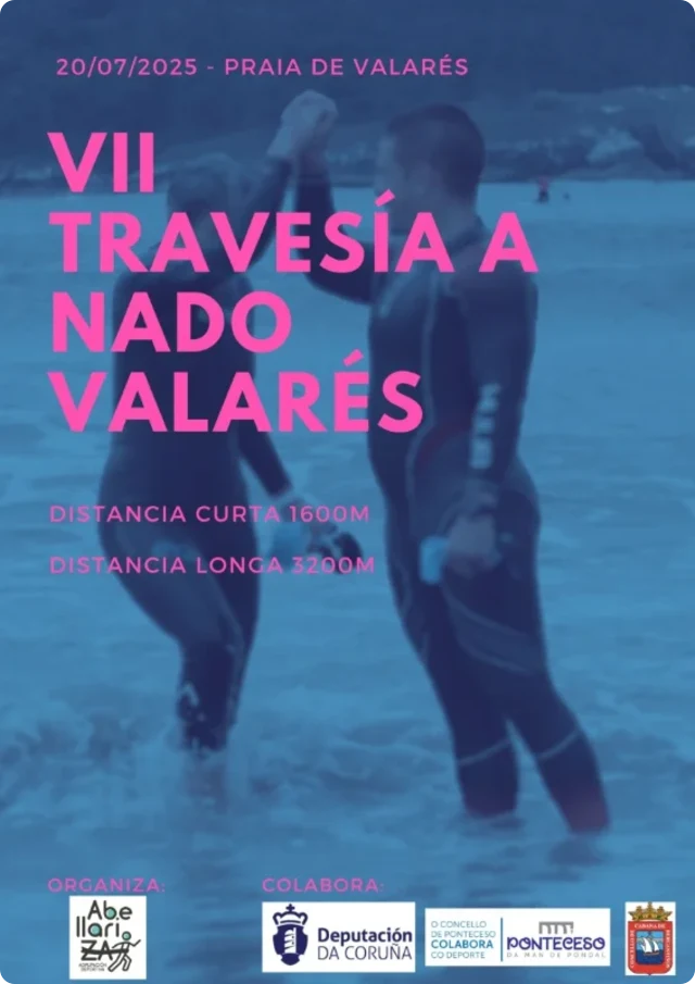 Travesía a nado de larga y corta distancia en la playa de Valarés. Evento organizado por AD Abellariza que permite nadar en un entorno costero gallego con dos recorridos diferentes.