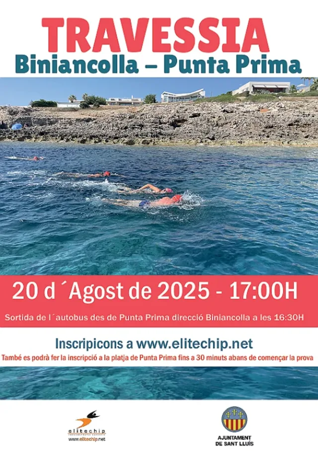 Recogida de dorsales de 15:30h a 16:15h en la Playa de Punta Prima. Salida de bus desde Punta Prima a Biniancolla a las 16:30h. Servicio de guardarropa disponible. Casco de natación para los 100 primeros inscritos.