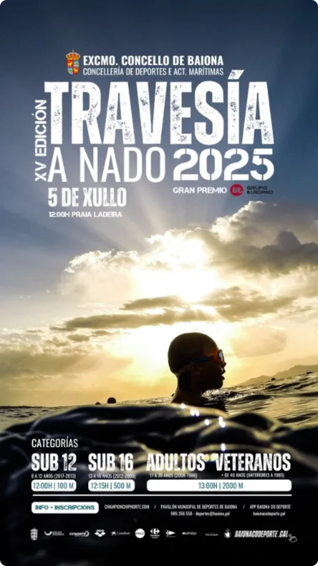 Travesía a nado mixta con diferentes categorías por edad, celebrada en la Praia Ladeira de Baiona. Evento popular que promueve valores sociales y deportivos.
